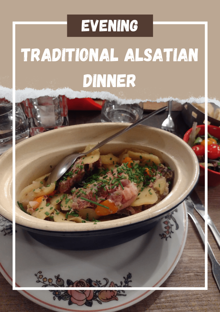 Finally, it is time to taste the traditional Alsatian food. My friend had the most typical casserole dish from the region, a mix of vegetables and meat called Baeckeoffe (“baker’s oven” in Alsatian dialect). I was surprised to find a vegan version of Flammekueche (also known as tarte flambée), a specialty of bread dough usually covered with bacon, or in my case, champignons. God, it’s so hard to be a vegan in this country, but not impossible!