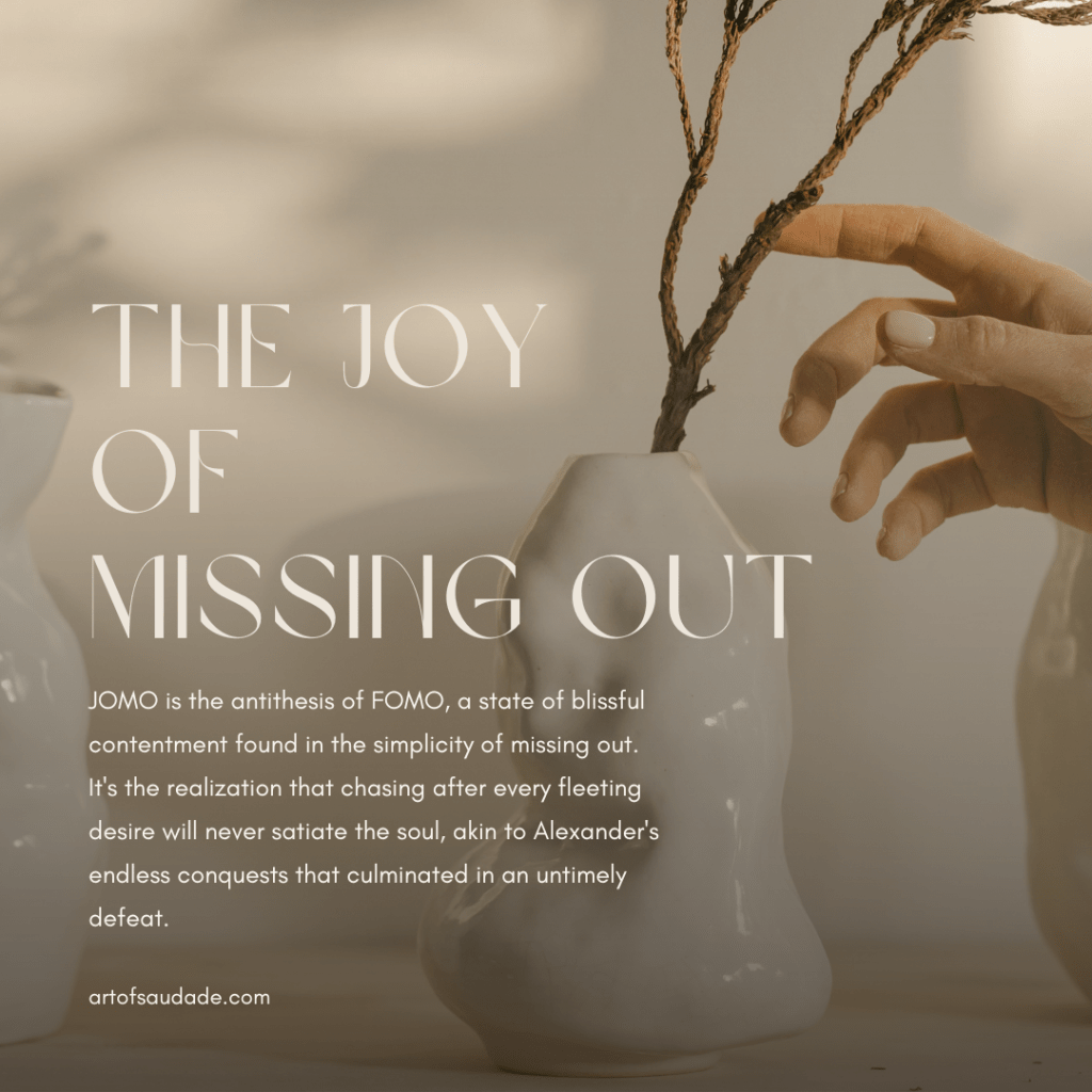 JOMO is the antithesis of FOMO, a state of blissful contentment found in the simplicity of missing out. It’s the realization that chasing after every fleeting desire will never satiate the soul, like Alexander’s endless conquests that culminated in an untimely defeat.